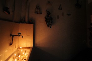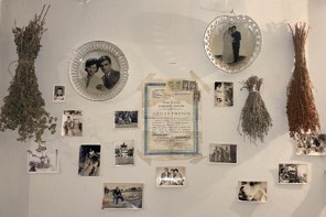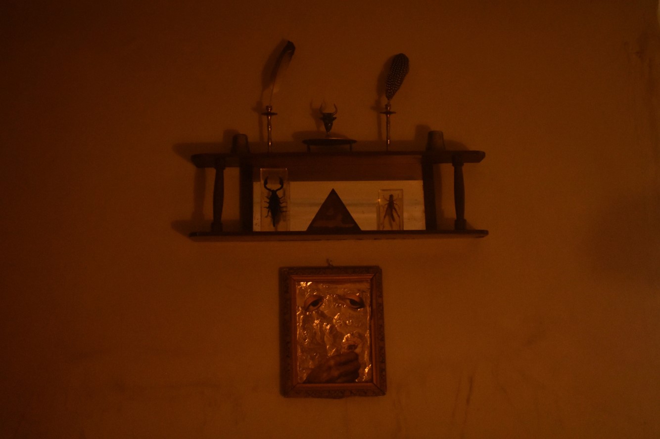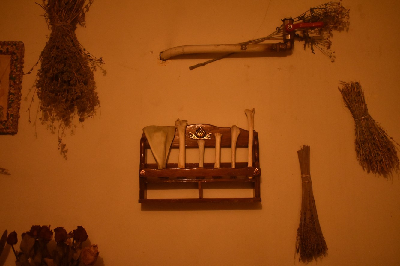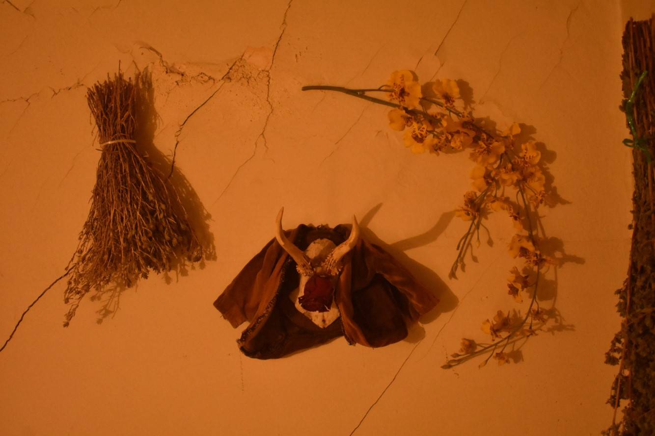 The installation (=to heal oneself) is not just a passive invocation. It invites visitors to ‘heal’, as the title dictates, through their exposure to a multidimensional and complex space. The installation is an introspective landscape, where collections of uncanny objects, toys, pictures, textiles, herbs and animal bones form a cabinet of curiosities. The highlight the primal need of human beings to collect,create and then exhibit, in order to ‘heal’ themselves, mirroring the Ancient Greek God Asclepius’ medicinal quality.