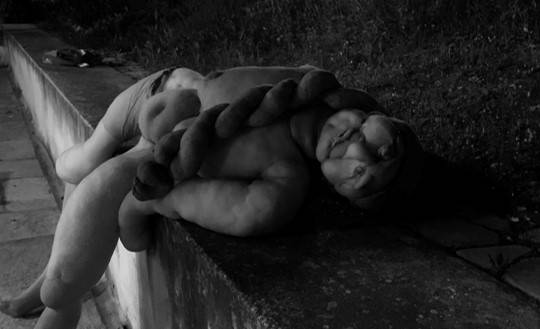 Asteroula (100x45cm) Wooden swing, pantyhose, cotton, bones, baby clothes The Caretaker (155x45cm) Mannequin, pantyhose, cotton, stones