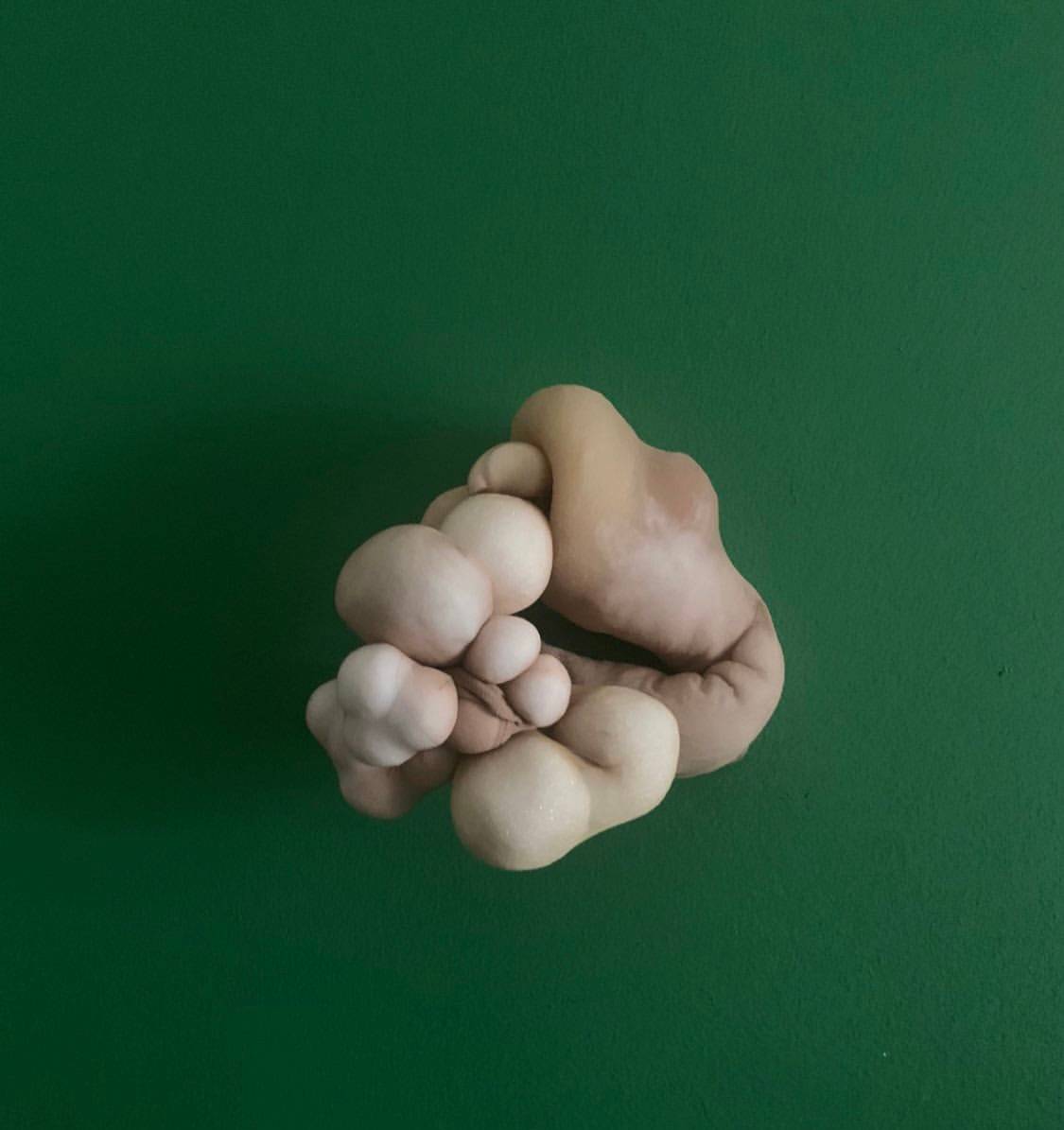Pantyhose, cotton, wood, dried mushrooms & leaves, beads, lace