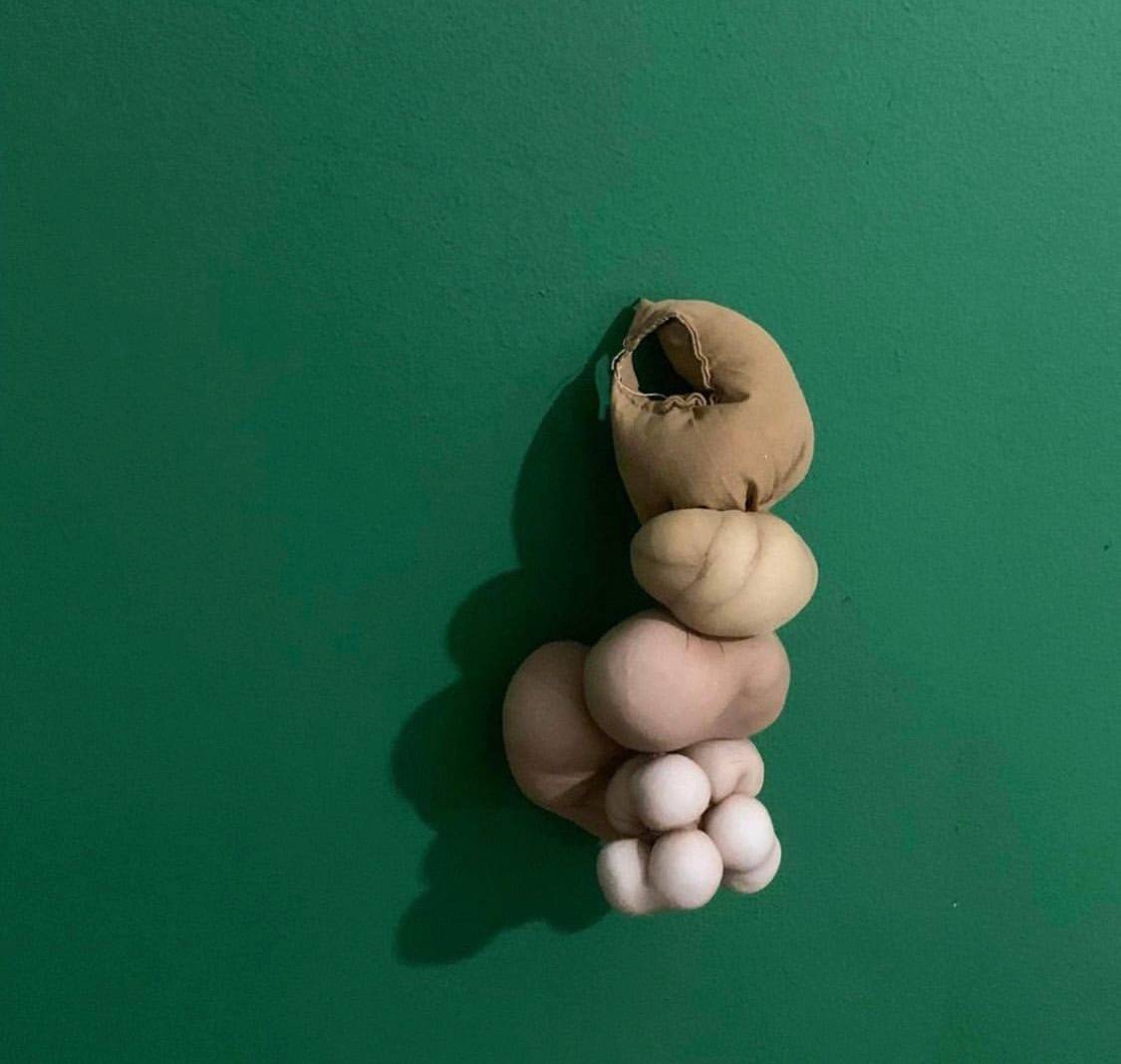 Wooden baby highchair, pantyhose, cotton, found & collected objects & naturalia Forthe Platforms Project 2024- International Independent Affair curated byArtemis Potamianou& Michalis Argyrou exhibitingwith adARTes atTobacco factory,Lenorman 219Athens